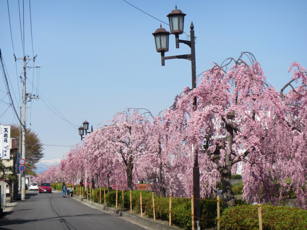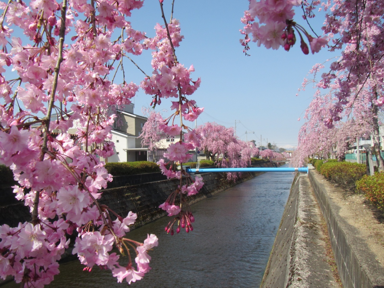両岸が桜の並木になっていて、毎年4月後半に行われる天童さくらまつりの一会場として、夜はライトアップもされます。