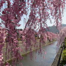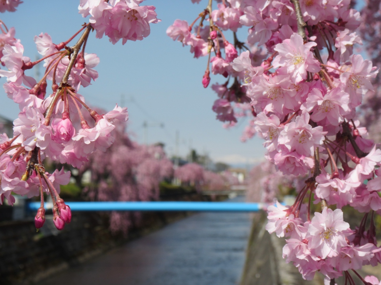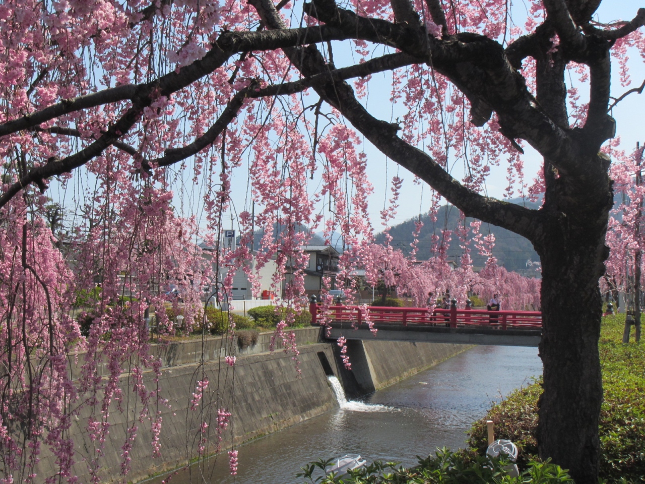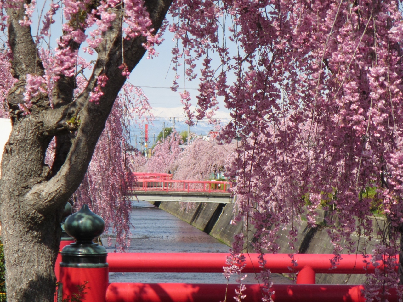 午前中に訪れると、遠く、西側にそびえる山塊の頂に白く雪が積もる様子が見え、桜と川に映えてきれいでした。
