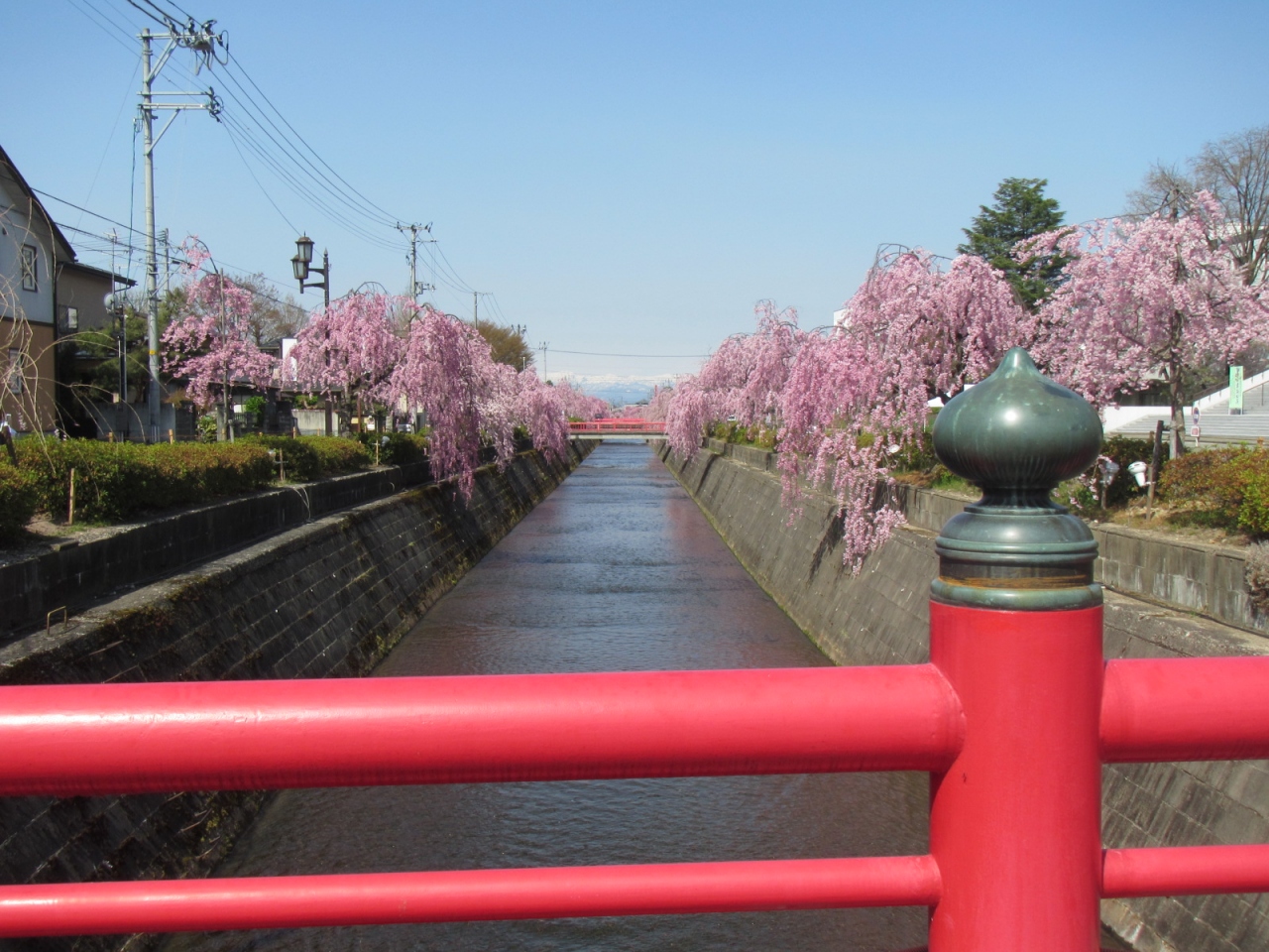 歩橋を境にちょうど川に角度がついている上、天童市役所近くの県道23号線の王将橋からでは、交通量も多くて落ち着いて眺められません。