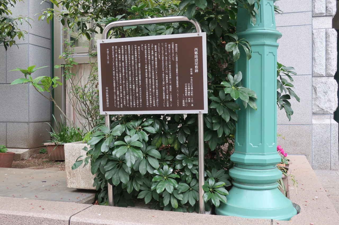 日本橋小学校・幼稚園の入口左手に西郷隆盛屋敷跡の立札があります。西郷隆盛と言えば上野のイメージが強いですが、その西郷隆盛の邸宅があったのが人形町だとは知りませんでした。しかし西郷隆盛屋敷跡には遺構は何も残っておらず、ただ立札が残っているだけで、歴史的事件があった訳でももなく、いくら幕末歴史好きの人でもあまり見ごたえはありません。