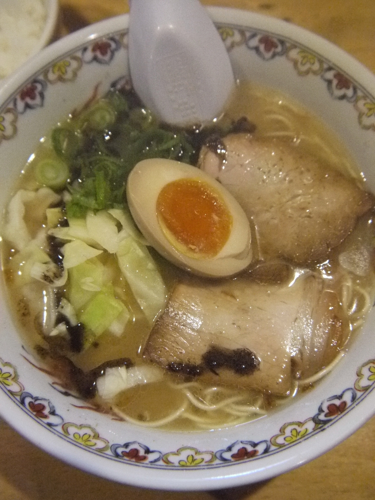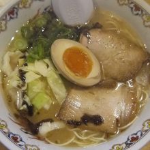 具は、チャーシュー(2枚)、味付け玉子、ネギ、こがし油。また、ラーメンでは珍しいキャベツもトッピング(少なくも店でキャベツは珍しい)。チャーシューは大きく、分厚く、食べ応えが。
