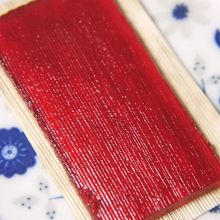 包装を開けると、2枚の薄い木の皮に挟まれた、寒天ベースの平べったいゼリーがある。木の皮を剥がして、いただく。