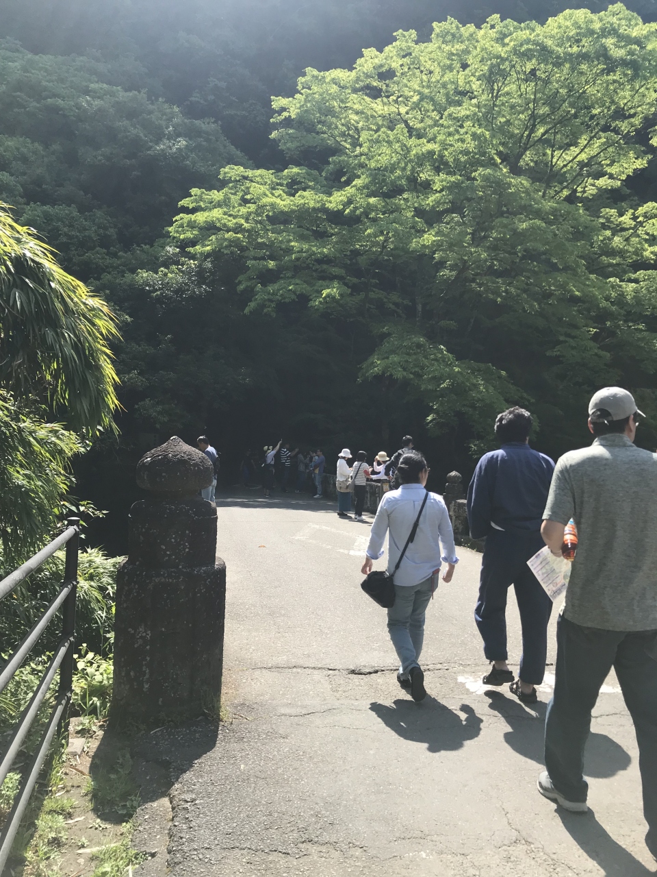 高千穂遊歩道へ行くために神橋を渡りました。車も通るような橋ですが、観光客が沢山いたため、遊歩道化していました。道は普通の道路ですが、欄干部分はだいぶ古くて趣があります。横から見ると石造りでアーチ状になっているのがよくわかります。
