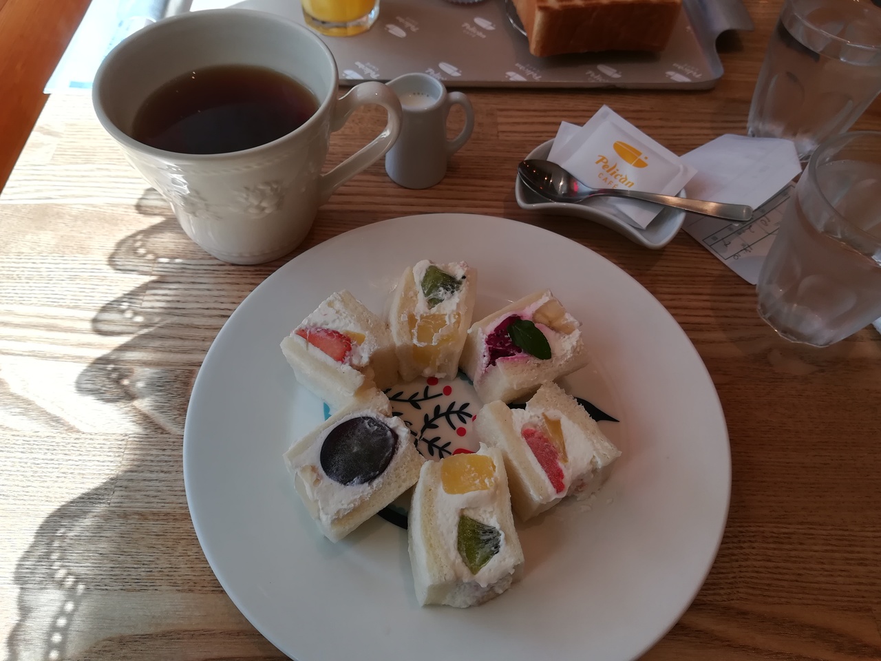 ペリカンのパンを買いに行ったのに売り切れでした。諦めきれず近くのこのお店に。ここならペリカンのパンをいただけます。トーストセットとフルーツサンドを注文。私たちにはフルーツサンドの方がパンの美味しさが味わえると思いました。回りを見渡すとほとんどの方が頼んでいたように思います。