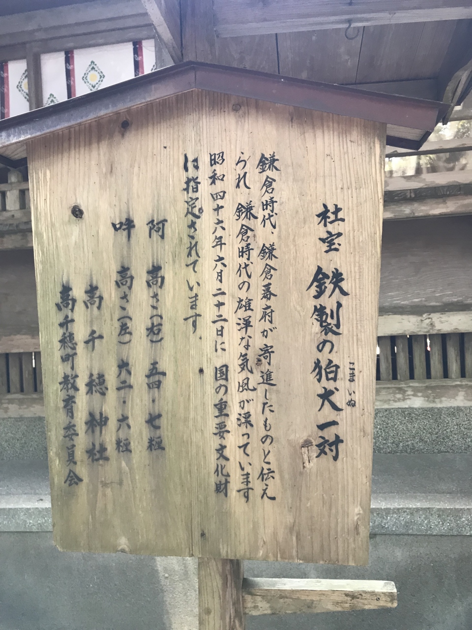 鎌倉幕府が寄贈したと言われる鉄製の狛犬です。本殿に大事に保存されていて、ガラス越し、手すりまであるので、全体像はわかりにくいですが、社宝を公開してくれているのはありがたいです。鉄製なので、見た目はゴツゴツした感じ。鎌倉時代製造というだけでも見ごたえあります。