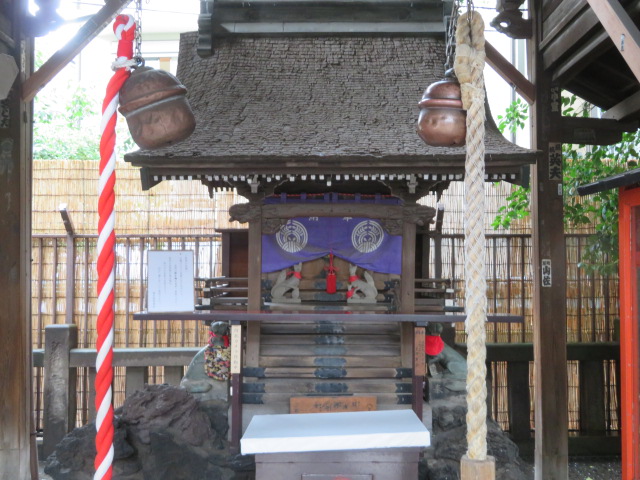 浅草観音本堂の東隣にある三社祭でお馴染みの浅草神社境内にある神社(末社)、創建は安政2年で京都伏見稲荷神社の分霊を頂いてます、社は小さく間口1.5m、奥行き1.4mです、創建当時の社が関東大震災、東京大空襲を逃れてそもまま残っています、就職や出世に後利益があると言われています、奥へ入るので参拝者の数は少なくなっています。