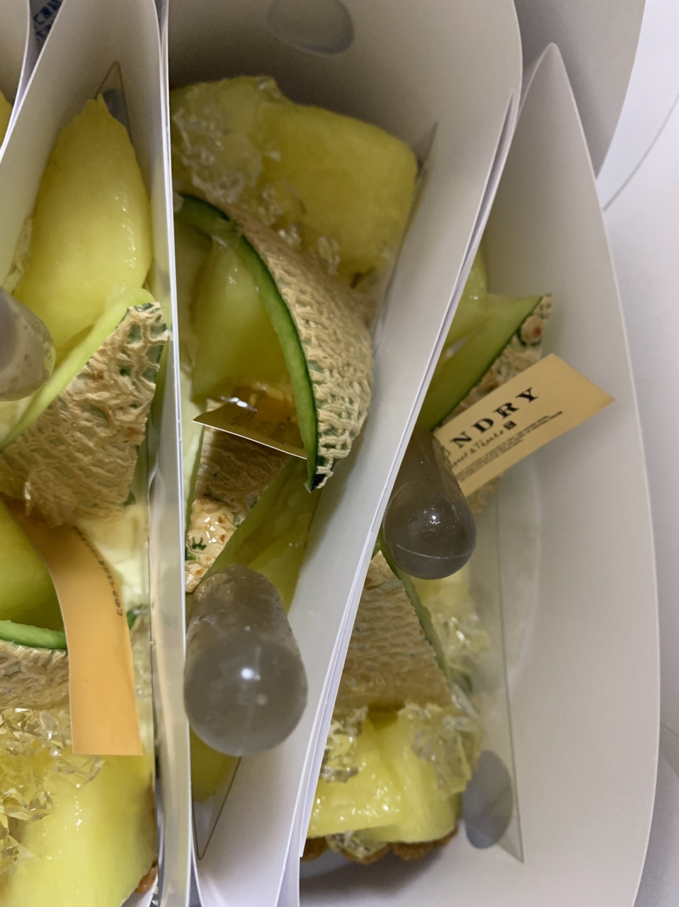 ケーキを購入しました。昨年も同じものを食べておいしかったので今回もメロンをリピート買いです。スポイトにシロップが入っていて自分で好みの味に調節しながらいただけました。メロンも甘くおいしかったです。サイズは大きいですが軽いのでペロっと食べれました。