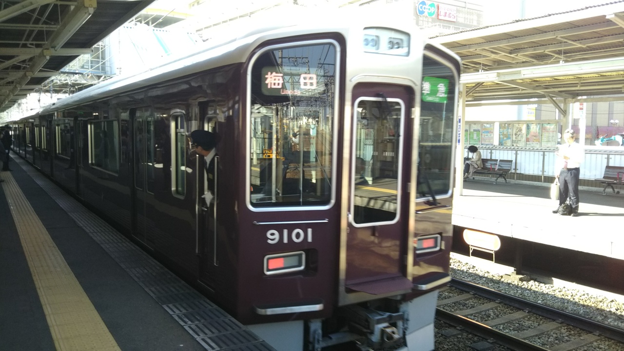 「蛍池」から「梅田」まで乗車しました。平日の朝8時過ぎということもあって、車内は非常に混雑していました。乗ってみると列車の内装がレトロな感じがして面白かったです。雰囲気があっていいですね。通勤時間帯ということもあってか、本数は非常に多く、ひっきりなしにホームに電車が到着していました。
