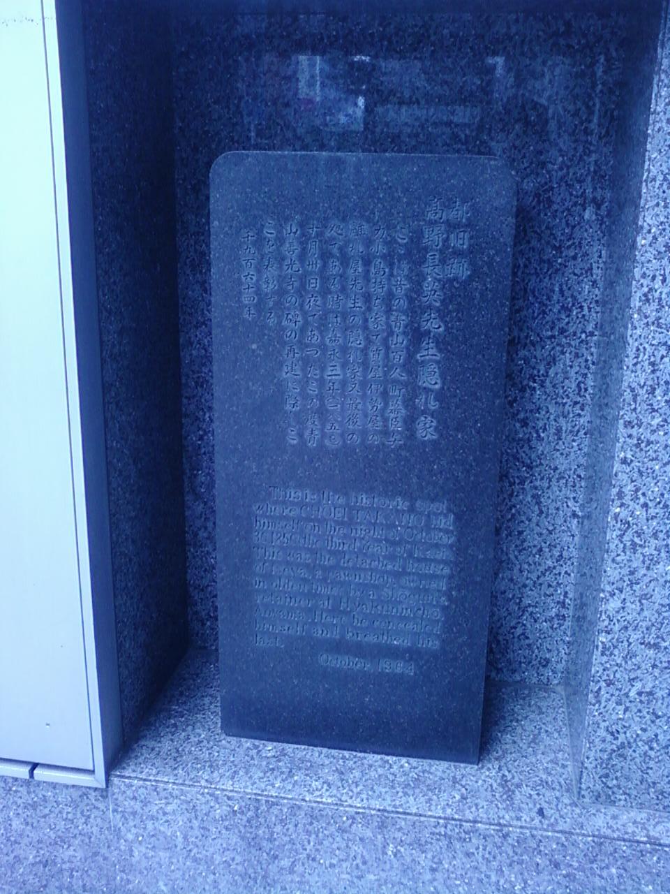 高野長英の隠れ家跡は、東京メトロ表参道駅のB1番出口を出てすぐ、スパイラルホールの入り口のすぐ左脇、柱の下の方にあります。何度もスパイラルホールに来ているのに、数十年経って今回初めて気づくほど、なかなか気づきにくい場所です。蘭学書を訳して江戸幕府に命を狙われ、身を隠しながら生きた高野長英。歴史の授業で習ったのを覚えています。沢三伯と名前を変え、かつてここにあった青山百人町の小島助次郎の借家にいたということです。そして1850年、とうとうこの場所が見つかってしまい、長英は捕らえられてその日に亡くなったとか。今では全く当時の様子の面影もない大都会に、こうして僅かながらも歴史の痕跡をうかがわせるものが残っていて嬉しいですね。