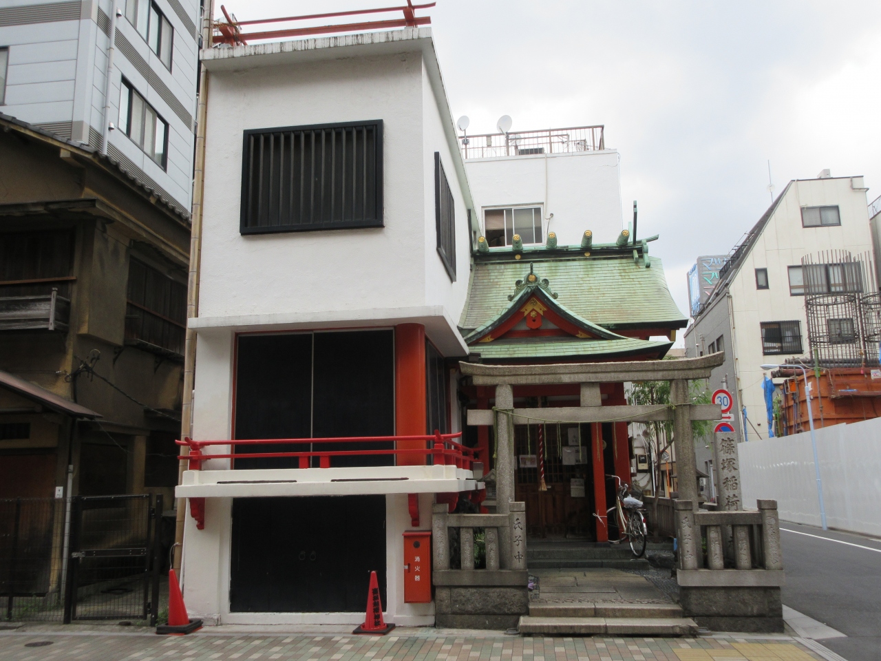 浅草橋駅から5分ほど歩いたところにあります。創建の時代は分かりませんが、新田義貞のころからありました。石造りの鳥居があり、境内を囲む石柱に奉納した相撲協会や両国花火協会の名がありました。商売繁盛、火防神として信仰されています。特徴は2階建て社務所に取り込まれるような社殿です。変わった造りの社殿が狭い境内に残っている印象を受けました。