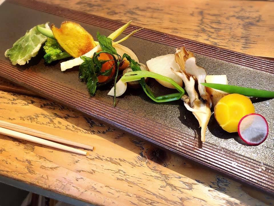 野菜中心のラインナップで、締めは赤酢のお寿司で美味しかったです。