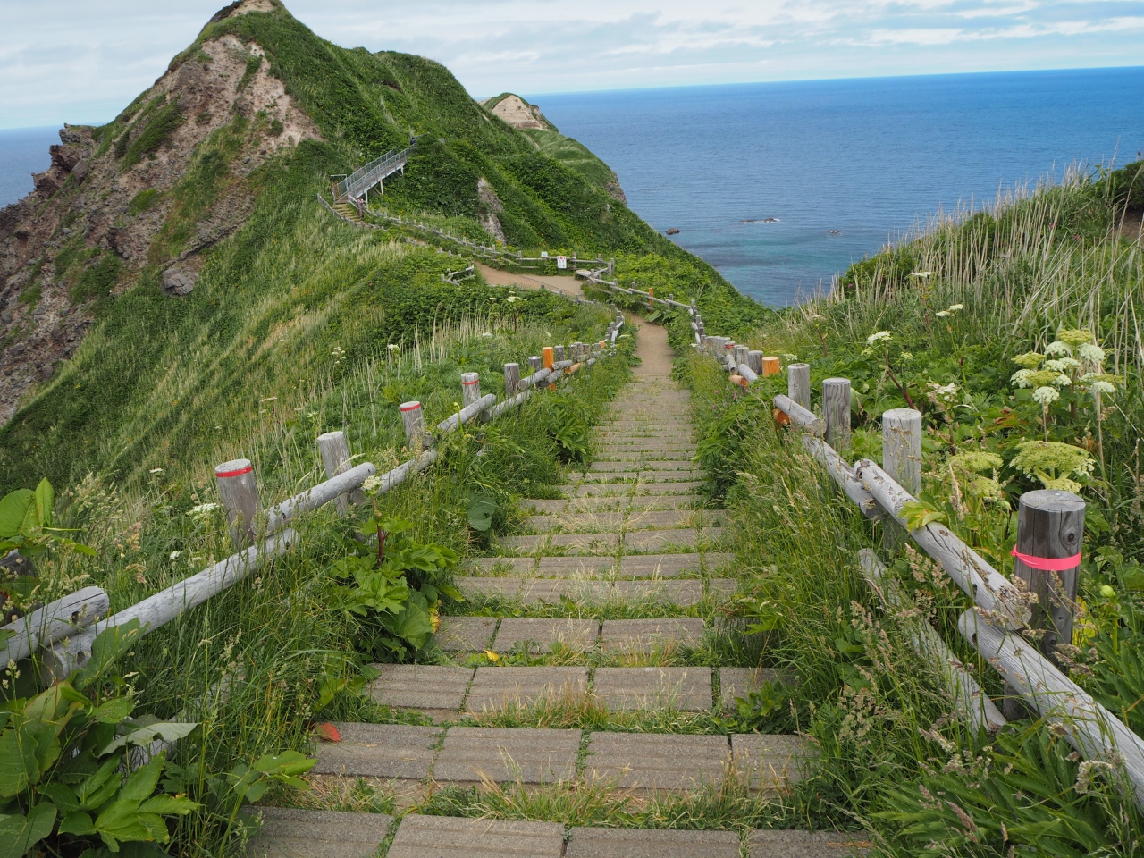 神威岬遊歩道はバス停などがある駐車場から神威岬への先端(灯台)までの道です。神威岬は細長い突き出た岬で、断崖がある岬です。そのため遊歩道は岬の先端までは山の尾根のようなところを歩いていきます。駐車場から灯台までの時間は片道、個人差はありますが、20分ほどです。遊歩道はアップダウンのある道なの少し歩きにくいです。また風が強いので、その注意も必要です。