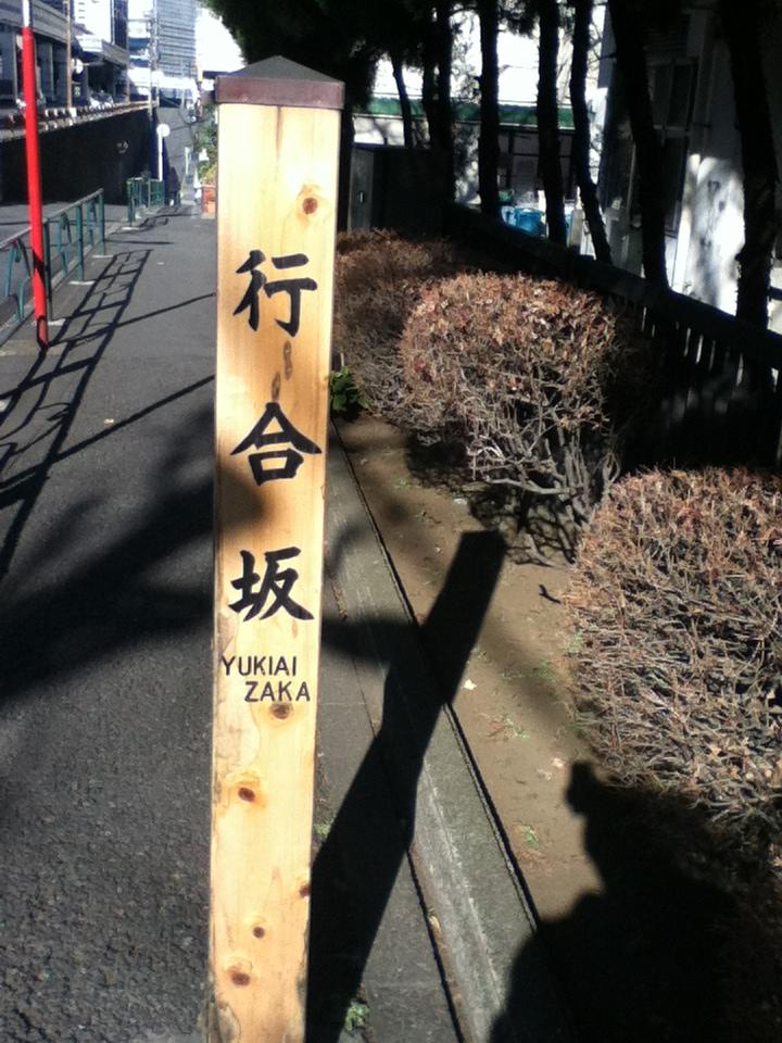 行合坂は飯倉片町交差点の北東、麻布小学校前付近から麻布通りとほぼ平行に北東へ下がりT字路を経て上り麻布通りに交わる坂である。長くなくあまり広くなく勾配は急ではなく、自動車や歩行者が時々通行していた。お勧めの点は、南側の坂上付近には紀州徳川藩屋敷跡の石碑、北側の坂上の少し先には山形ホテル跡の説明版があること、坂沿いにはやや古い中層のオフィスビルやマンションが並び麻布台の典型的な街並みが広がっていること、坂の名称は双方から行合う道の坂であることからつけられたこと、ほぼ平行している延びる麻布通りに比べ自動車の通行量は少なくゆっくり坂周辺の街並みを見れることである。訪問時の感想は、行合坂は意外に自動車や歩行者が少なくゆっくり紀州徳川藩屋敷跡の石碑や麻布台の街並みが見れてよかった。