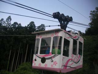 近鉄の吉野駅に着いて少し歩くと吉野大峯ケーブルの千本口駅で、夏場はまだ明るいですが最終は17時40分発です。日本最古のケーブルカーで、小さめの車両で発車して、谷を渡ると反対側のケーブルカーが通過して、5分ほどで吉野山駅に着きます。