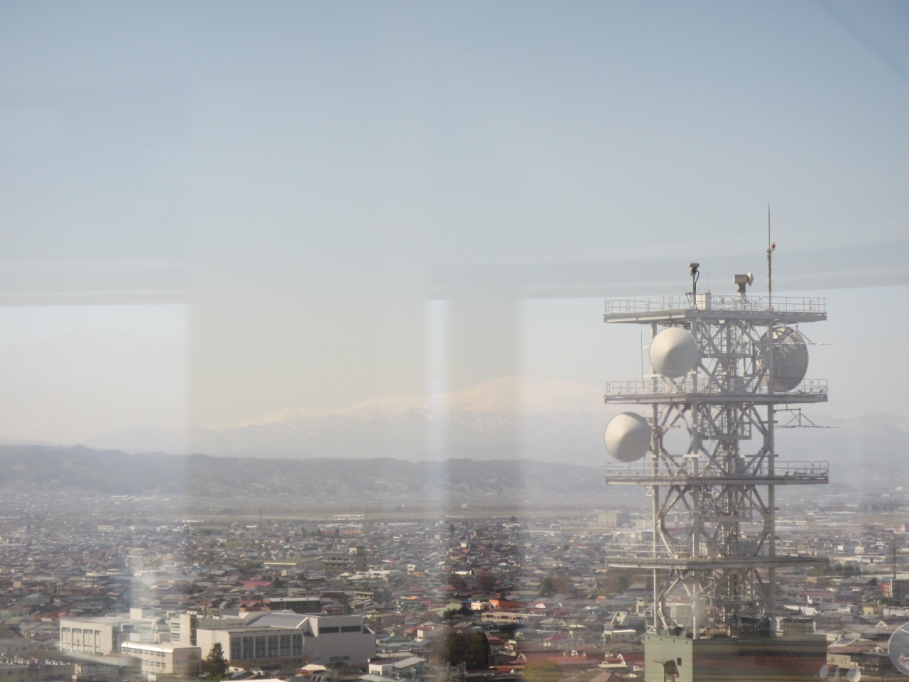 展望室はそれほど広くはありませんが、360°見渡せる回廊になっていて、はるか山形盆地や月山などの周囲の山並みを見渡すことができ、訪れた時は桜満開の霞城公園も見えました。