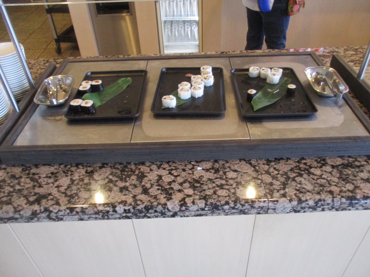 ユナイテッド クラブ ラウンジのフードメニューに寿司があるのが嬉しかったです。スーパーフライヤーズグループであるANAのラウンジには細巻きの寿司がありますが、こちらはまぐろ、エビなどのにぎりがあります。わさびもきちんと置いてありました。