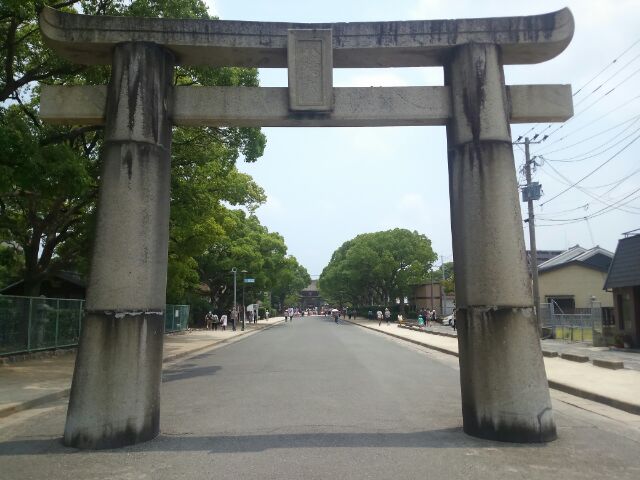 天神にて、空港に移動するまで1時間ほど空いた…ということでちょっと寄り道してみました。地下鉄の路線図を見上げて「箱崎宮前」とあったのをみつけ、地下鉄の駅名になるくらいだから有名なところだろうし、時間の調整も楽だろうと見当をつけた程度で、全く予備知識ありません。駅に到着して地上に上がってみるとそこは参道の途中。まさに「箱崎宮前」でした。