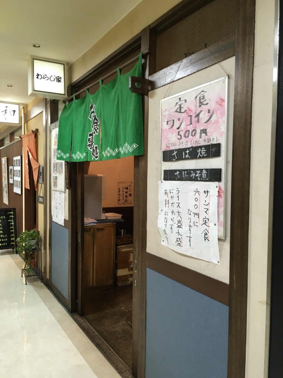 平日のランチタイムに立ち寄り、あじ焼きを注文しました。この時は手ぬぐいを巻いたおじさんが一人でこなしていました。ご飯に味噌汁、お茶、卵焼き1切れがついて570円。沢庵がカウンターに置いてあって自由に食べられる。あじの焼き加減が絶妙でした。