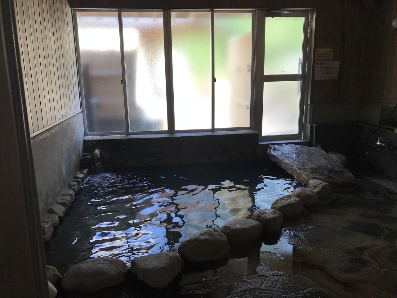 内湯と露天風呂のある循環式で若干消毒臭(塩素臭)がするぬめりのある温泉だった。