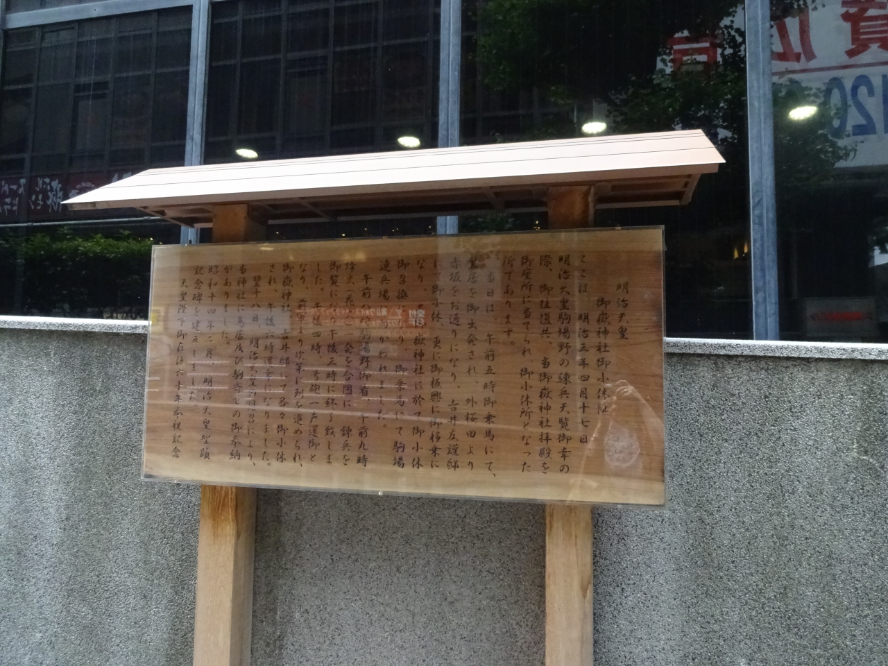 明治3年に明治天皇がここで休憩したとのことで、境内に石碑が建っているが、鳥居前にも詳しい説明板が置かれていた。