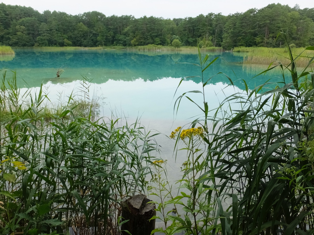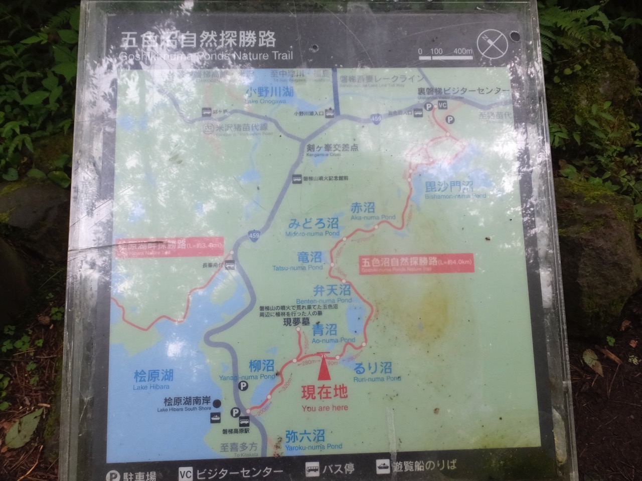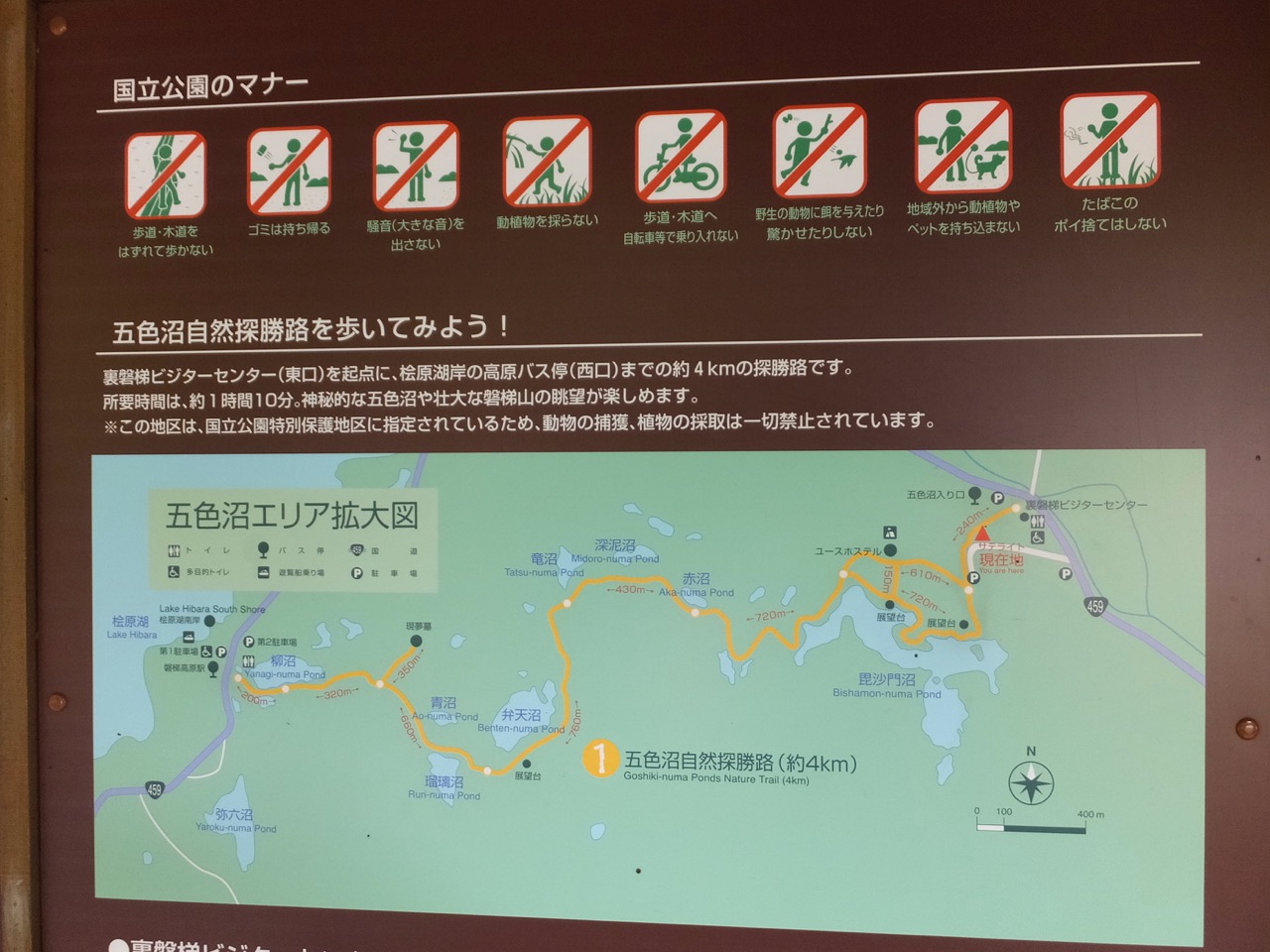 全コースゆっくり歩いても50分くらい。各池で5~10分滞在して90分。お手軽ですが変化に富んだハイキングコースです。ビジターセンター側からでも磐梯高原側からでもいいのですが、磐梯高原側からの方がくだり坂で少しラクです。それと、終点のビジターセンター側にはお店も多く、ビジターセンターもあって時間を調整しやすいことから、バスの場合はとくに磐梯高原側から入った方がいいでしょう。ところで、通り抜け型のハイキングコースなので、車の場合は一方に停めてしまうとまた歩いて帰ってこなければならない点が面倒なところ。なので、片道バスの利用を考えるか、だれか再訪者と一緒に行ってその方に観光を諦めてもらって車を回送してもらうとか、1人は途中弁天沼~磐梯高原、あたりの往復だけにして車を回送する、などを考えられます。