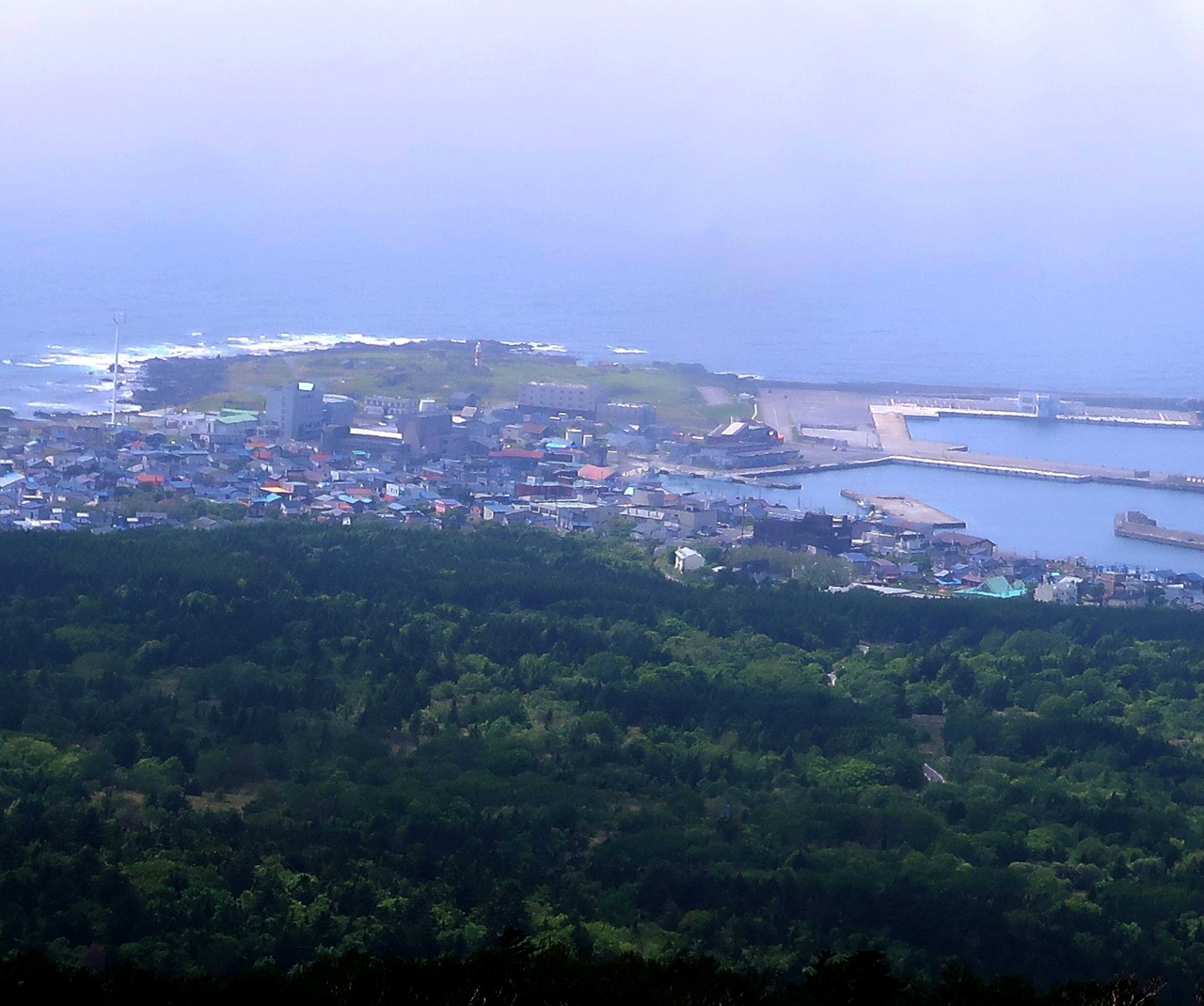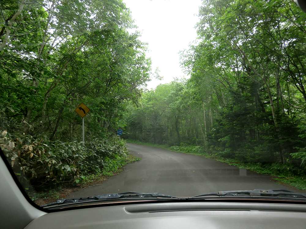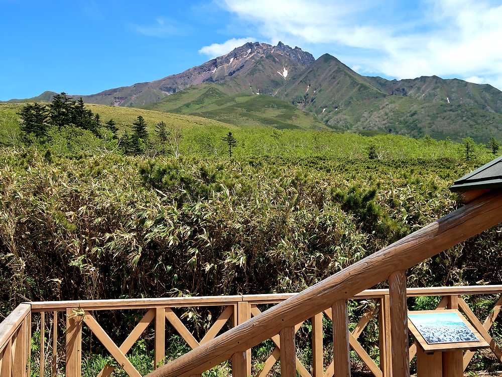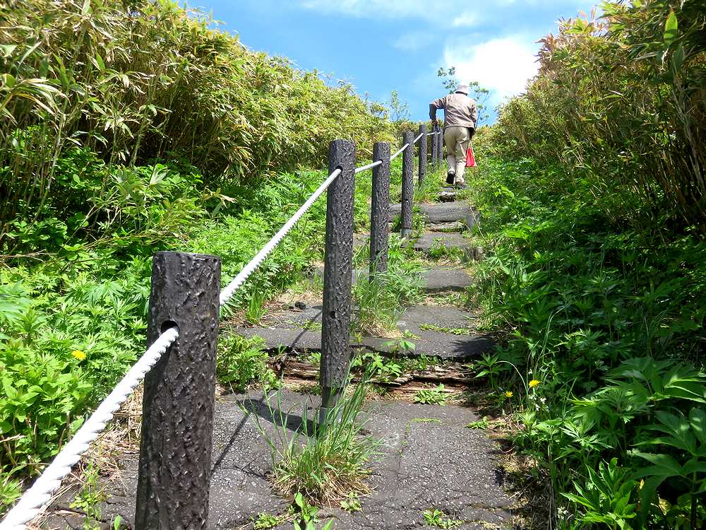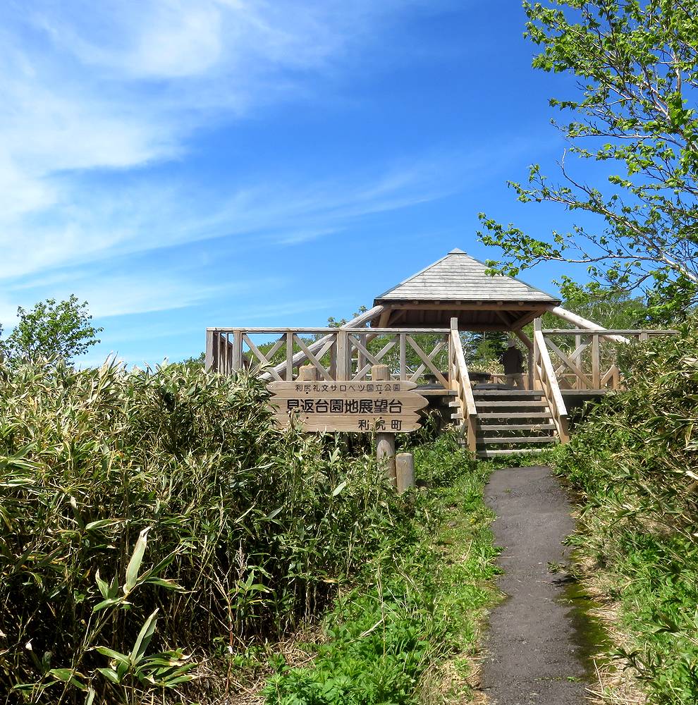 利尻山へ登る元気はなかったので、せめて5合目まで行ってみようと、軽自動車をレンタルして行きました。沓形で昼食後、舗装された坂道を登ること15分くらいでトイレのある広い駐車スペースに着きました。軽自動車でも、登りには支障がありませんでしたし、時間帯がよかったので、バスにも会いませんでした。駐車場にいた青年たちに展望台からのながめを聞いたら、霧があるので、登っていないとの返事。下は晴れていたので、だめもとで登ってみることにしました。展望台までは傾斜の緩い100段の階段が続き、登山用のストックを使いながらの楽な登りで、10分もかからなかったと思います。展望台に着くころには霧が晴れ、利尻山の頂上まできれいに見渡せました。あきらめないで登ってみるものです。残念ながら沓形港方面の眺めは上空に雲があり、霞んでいていまいちでした。利尻山の西側は雲がわきやすいところなので、クリアに見えたのは本当にラッキーでした。ここは雲一つない快晴のときに訪れることをお勧めします。