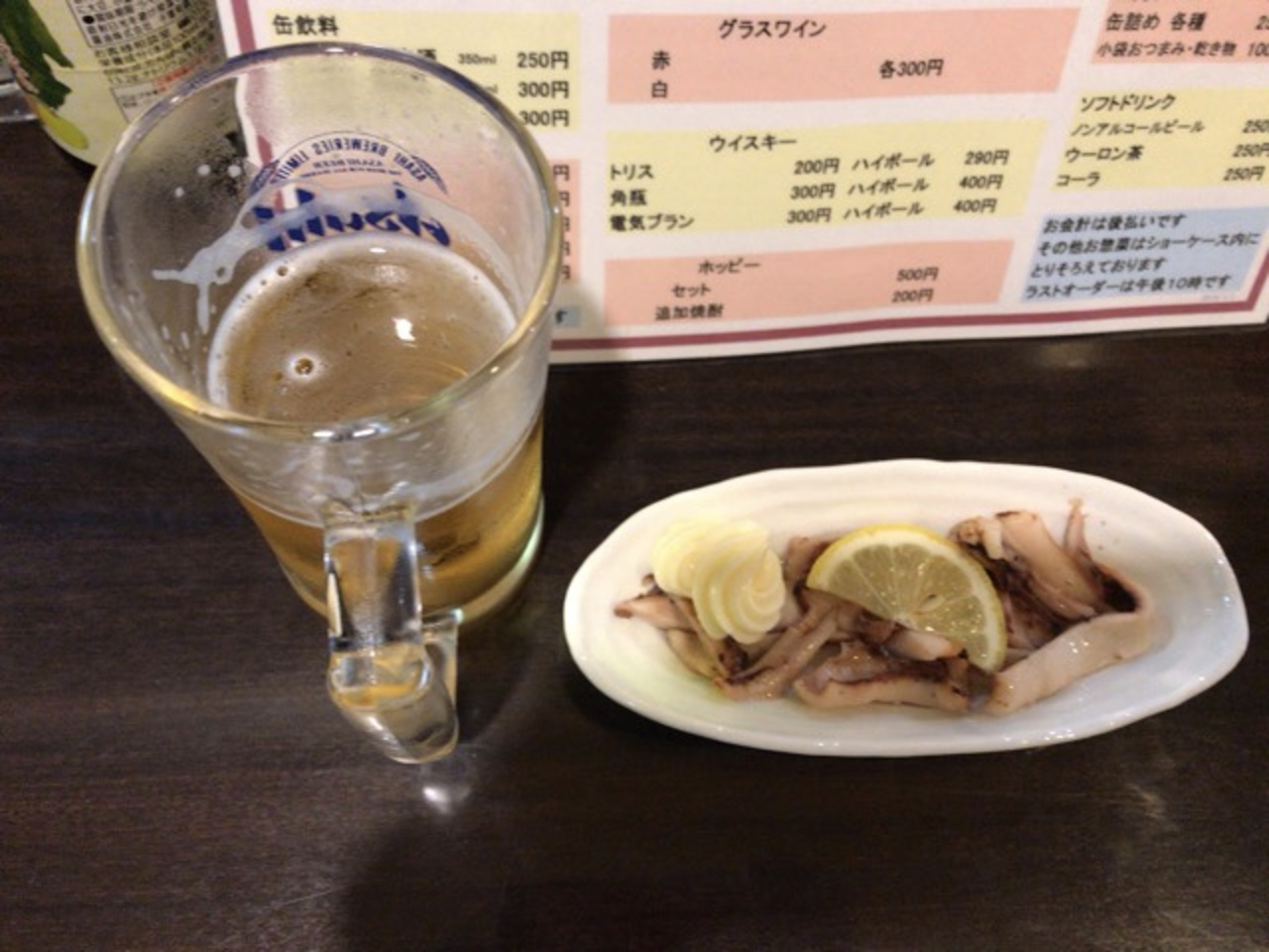 酒の種類は日本酒、ビール、焼酎など豊富、しかも安い。つまみはおでん以外やや弱いかな…。