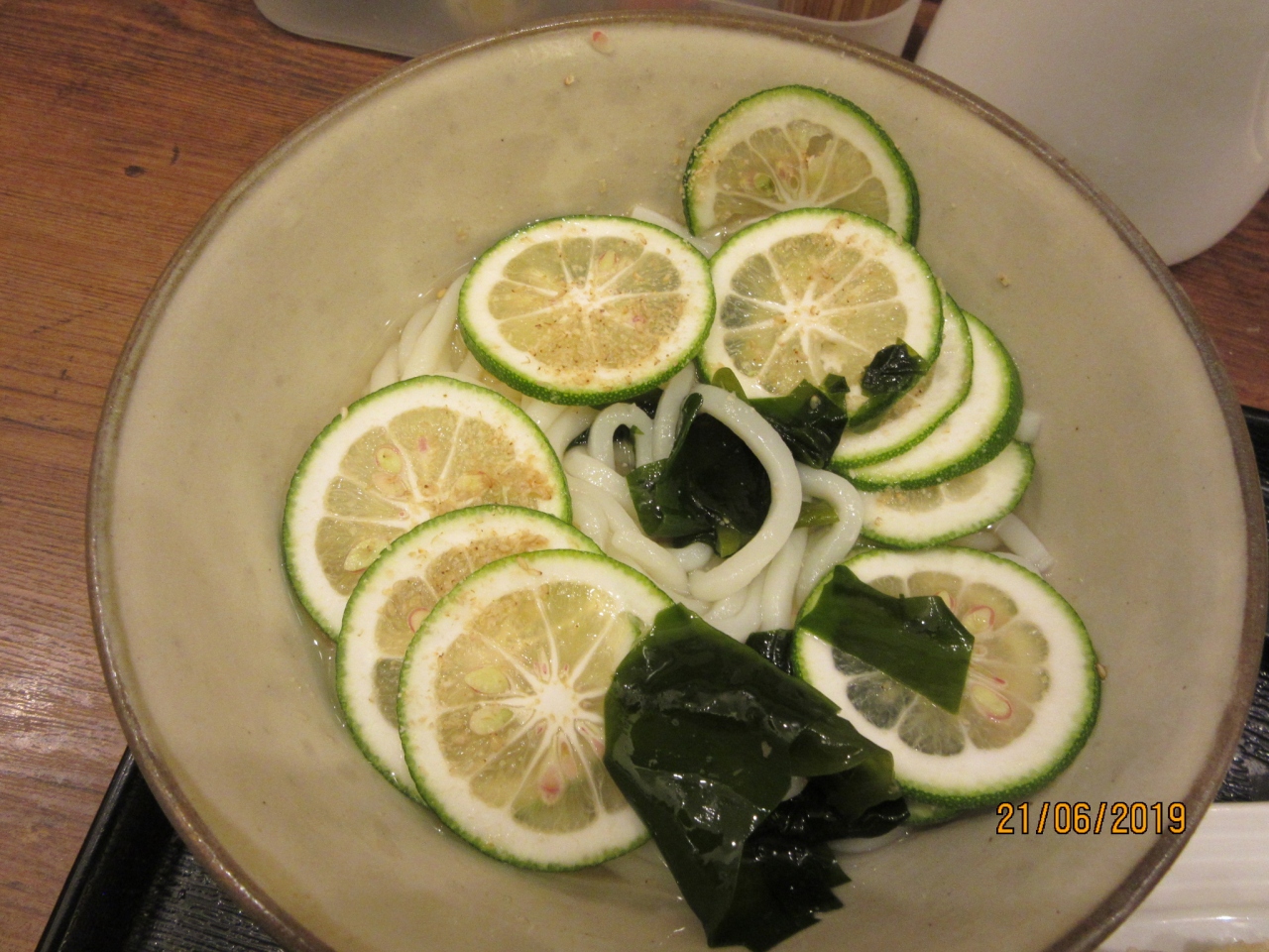 【カボスうどん】が目に入り注文してみた。店は立ち席、カウンターとテーブルだがさほど広くない。食券を購入する仕組み。切ったカボスが何枚も入った冷やしカボスうどんはさっぱりとした味覚で夏にぴったりだと思った。