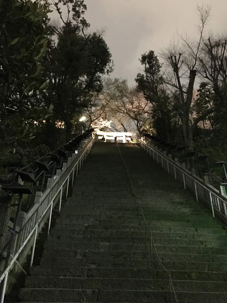 夜にしかも低いヒールのある靴で石段を登ることに無謀とは思いつつ挑戦しました。