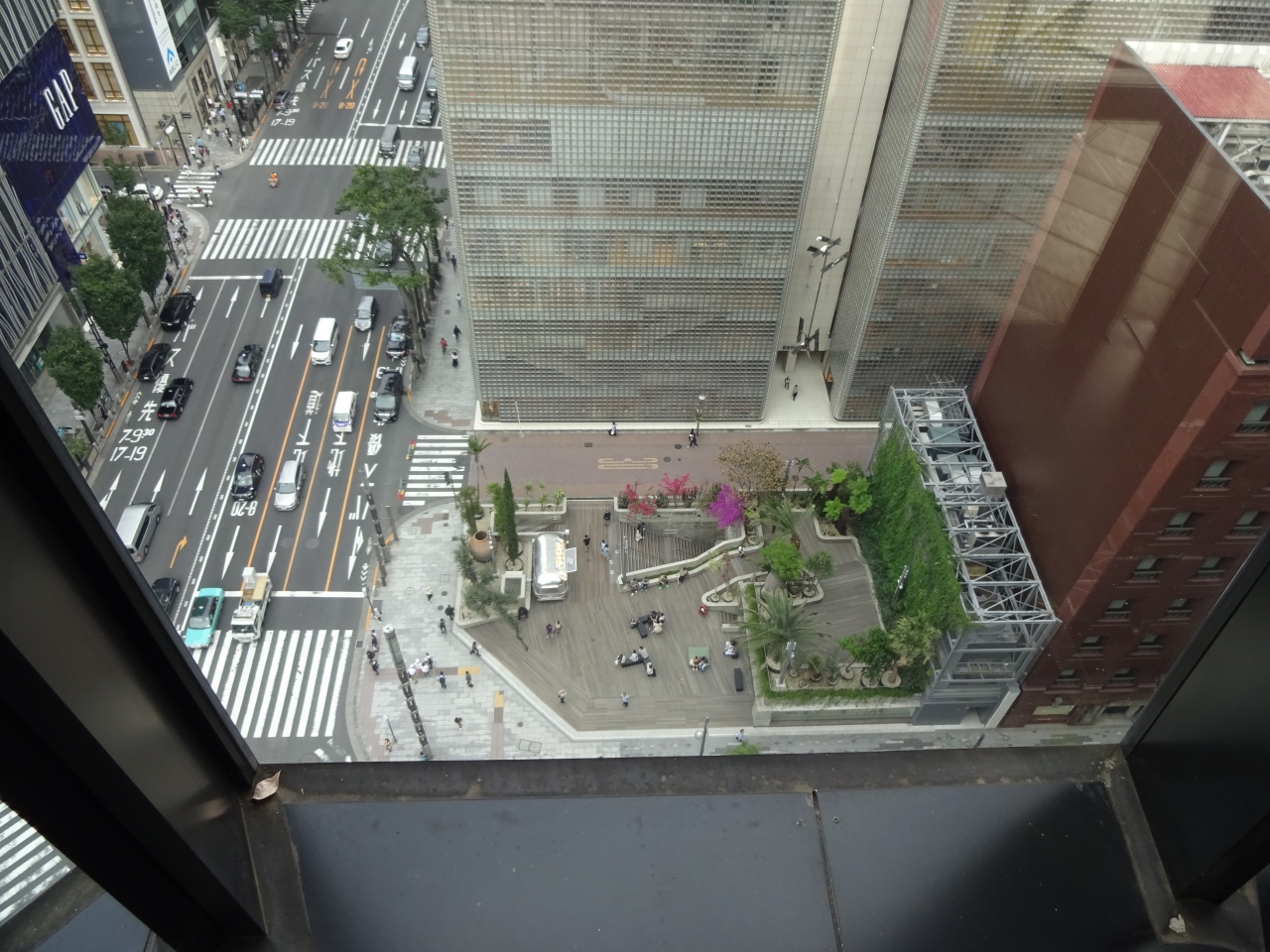 屋上のスペースには緑も多く、またちょう上からは数寄屋橋の交差点も、ソニープラザもながめられるので、楽しめる。