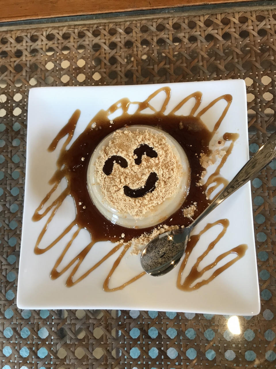 お蕎麦は美味しかったです。スイーツのほうは、お豆腐なのでかなりあっさり目でした。お茶目なスマイルマークのデコには笑ってしまいました。