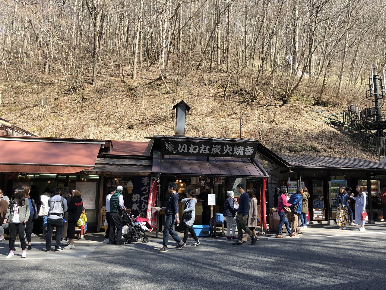星野温泉から白糸の滝まで、野鳥森を抜け約10km のハイキング。白糸の滝には食事をするお店が少なく、露天店でとうもろこしやいわな炭火焼やおやきなどが売られています。