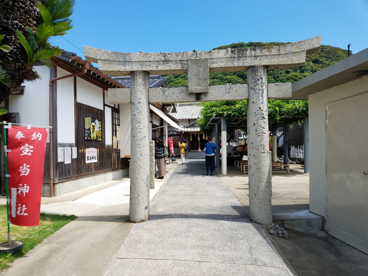 福岡から高速バス、地下鉄・JR筑肥線を使い定期船、海上タクシーで1.5~2時間程で行ける唐津の高島にあります。定期船の舟着場から猫ちゃんの足跡をたどり5分以内です。途中には有名なお店や少し離れた所に宝くじ売り場もあります。神社はさほど大きくありませんが、パワーを感じること間違いなしです。本殿に入り参拝することができますし本殿裏手にある御神体にも必ず参拝しましょう。宝当神社参拝前に氏神さまである塩屋神社にお参りするとよいと言われています。小さな島ですが、時間がゆっくり流れとても心地がよいひとときを過ごせます。