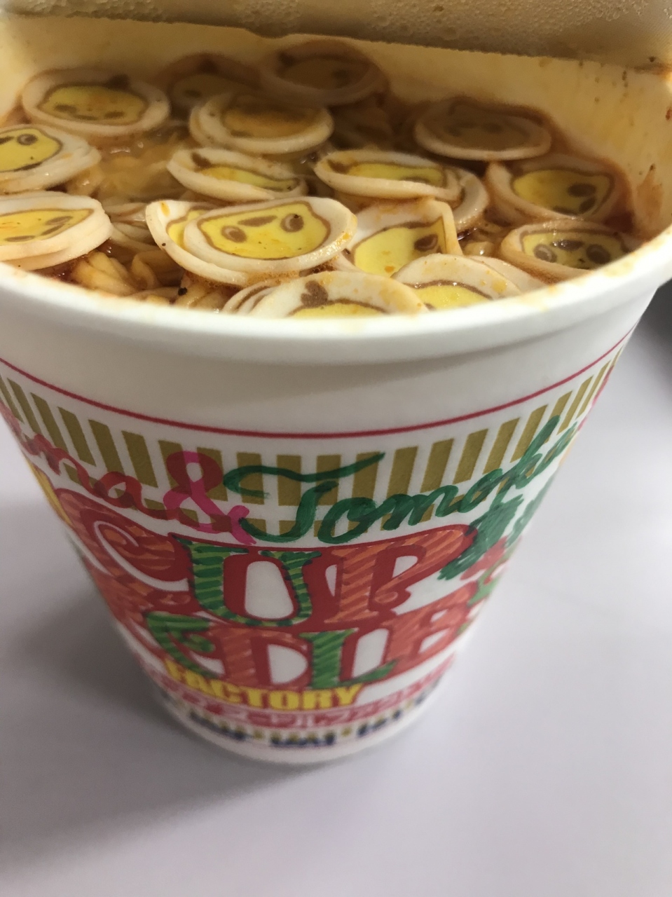 カップ麺を自分好みに作ることができます!まずカップを自販機みたいな機械でかいます。そのあと、テーブルに案内されたら、カップに絵を書きます!絵を描く時すごく悩んだので、悩みやすい人は、あらかじめ計画を立てた方がいいかも!そのあと、具や、味を選んでいきます!可愛くしたくて、ひよこちゃんいっぱいにしました。