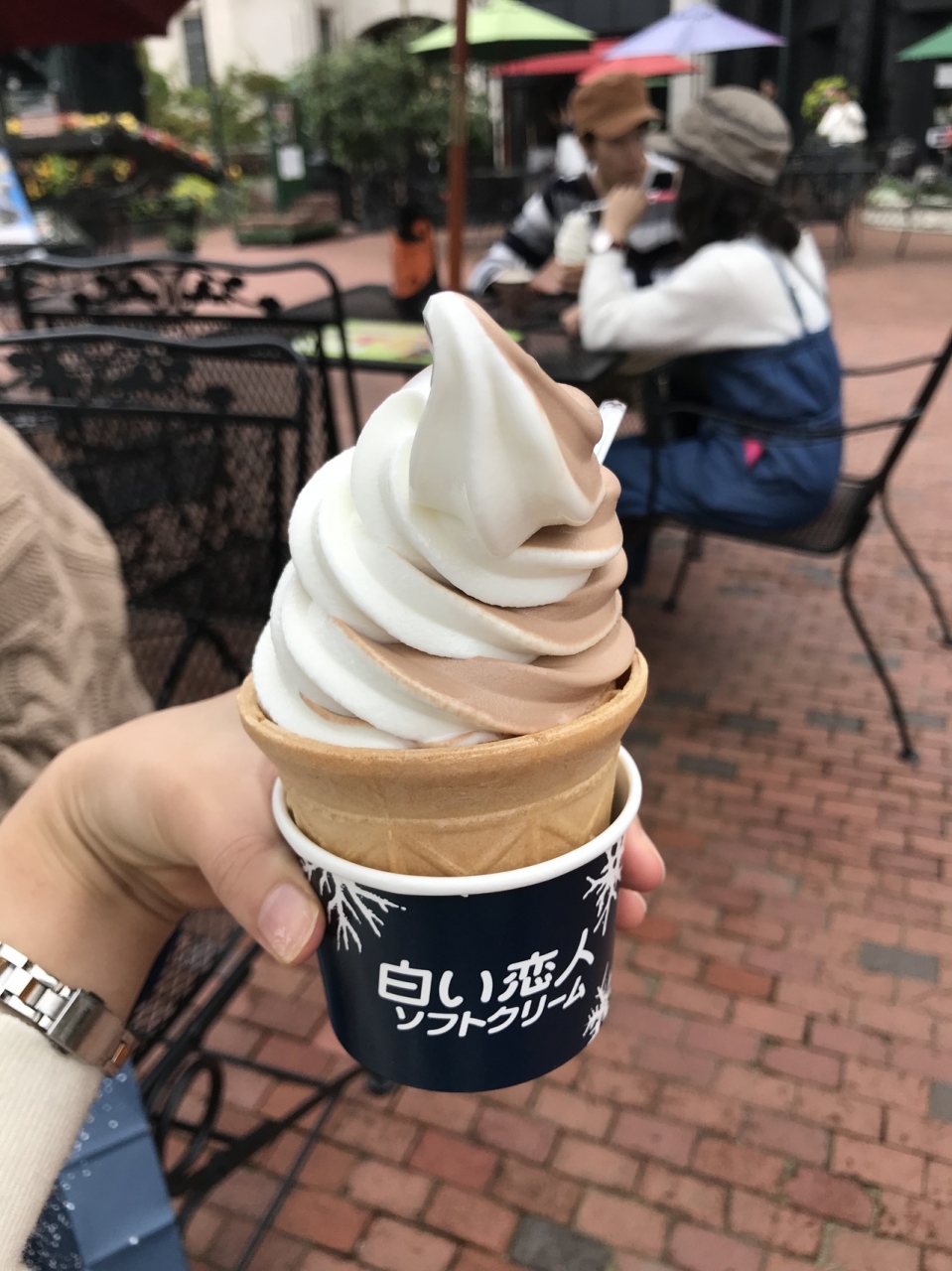 白い恋人に挟んでいるチョコレートが好きなので、その味のソフトクリームで、めちゃくちゃ美味しかった!ミルクチョコか、ホワイトチョコレートを選ぶのに悩んだので、2つの味を楽しめるものをチョイス!結局どちらも美味しくて正解でした!カップも白い恋人と書いていてよかったです。