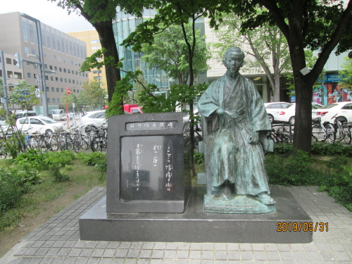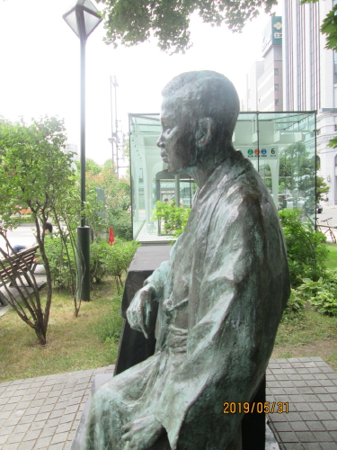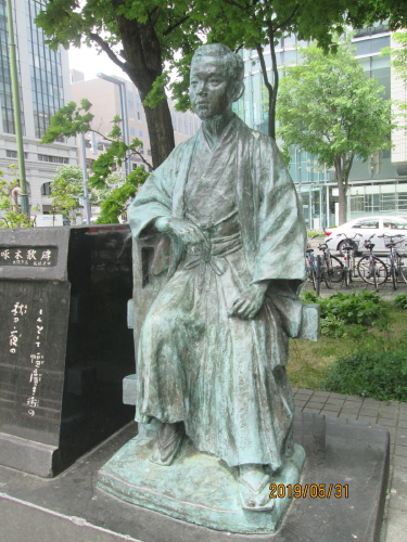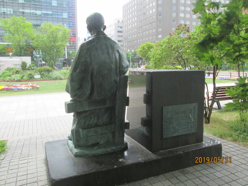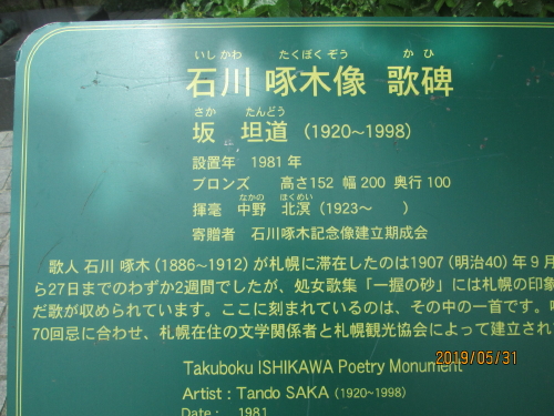 歌人 石川 啄木(1886~1912)が札幌に滞在したのは1907(明治40)9月13日から27日までのわずか2週間でしたが、処女歌集「一握の砂」には札幌の印象を詠んだ歌が収められています。ここに刻まれているのは、その中の一首です。啄木の70回忌に合わせ、札幌在住の文学関係者と札幌観光協会によって建立されました。