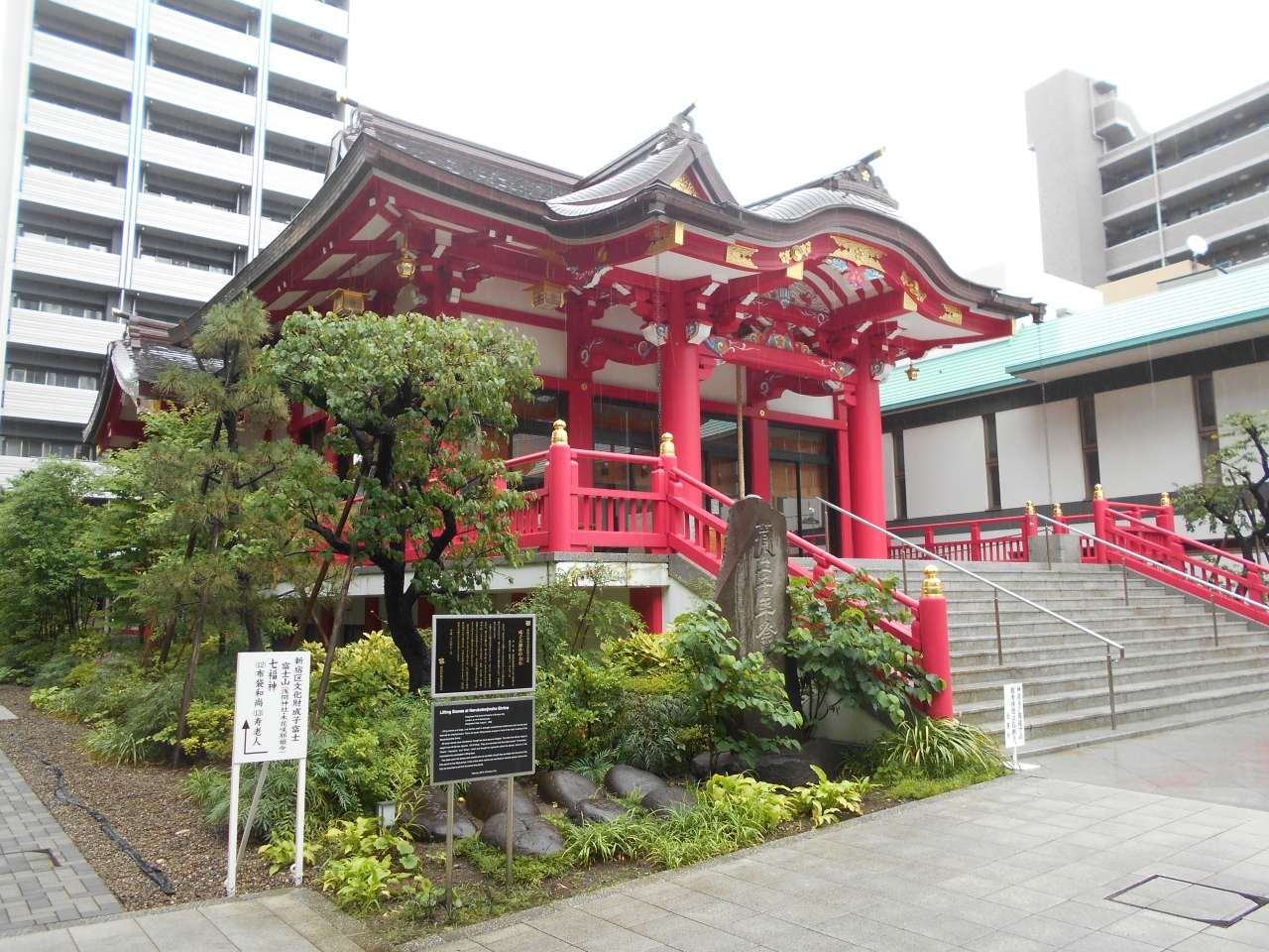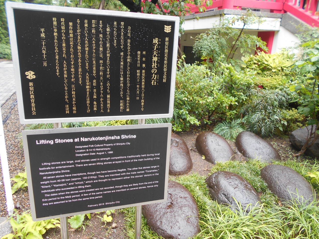 ここ西新宿の成子天神社 はビルに挟まれた細い参道の奥になるが、拝殿のすぐ脇に7つの力石が奉納されている。奥まっているので青梅街道を通っていても気付かない名所だ。