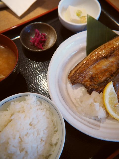 メインの皿には、焼いたしまほっけがでんと乗っていて、大根おろしとレモンが添えられている。しまほっけは身が厚く、適度に脂が乗っていた。かなりのボリュームがあり、食べ応えが。塩を振った上で焼いているので、大根おろしに掛ける醤油は最小限でよい。身は勿論、皮・尾・骨まで食べられた。