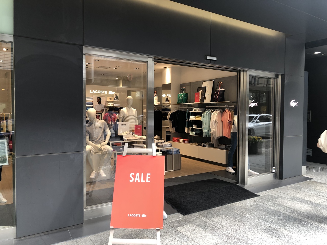 6月の梅雨時ですが、山下公園付近に用事あり、天気が良かったので元町までやってきました。元町商店街を元町・中華街駅から石川町駅方面へ歩いていくと、ラコステがあります。この日はセールの看板が出ていたので立ち寄りました。ポロシャツが素敵です。