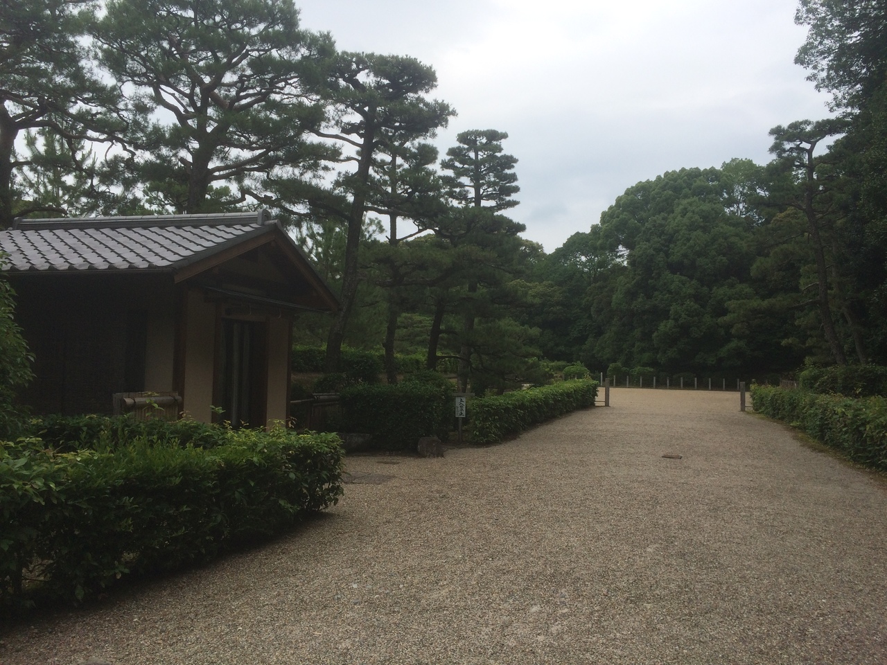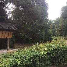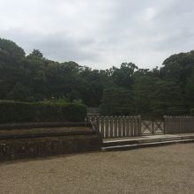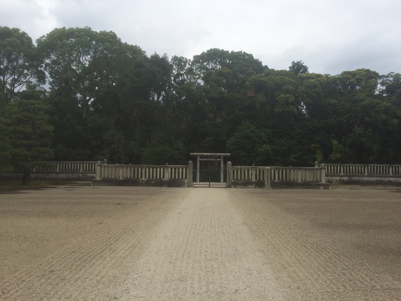守衛所のような小屋の建物がありましたが警備員はいませんでした。柵があり近くまでは行けませんが天皇陵に相応しく厳かな感じが漂っている場所でした。柵の向こうの地面はお寺の境内のような砂地で綺麗にしてありました。柵の向こうにはまた柵があり鳥居があり後方は林でした。