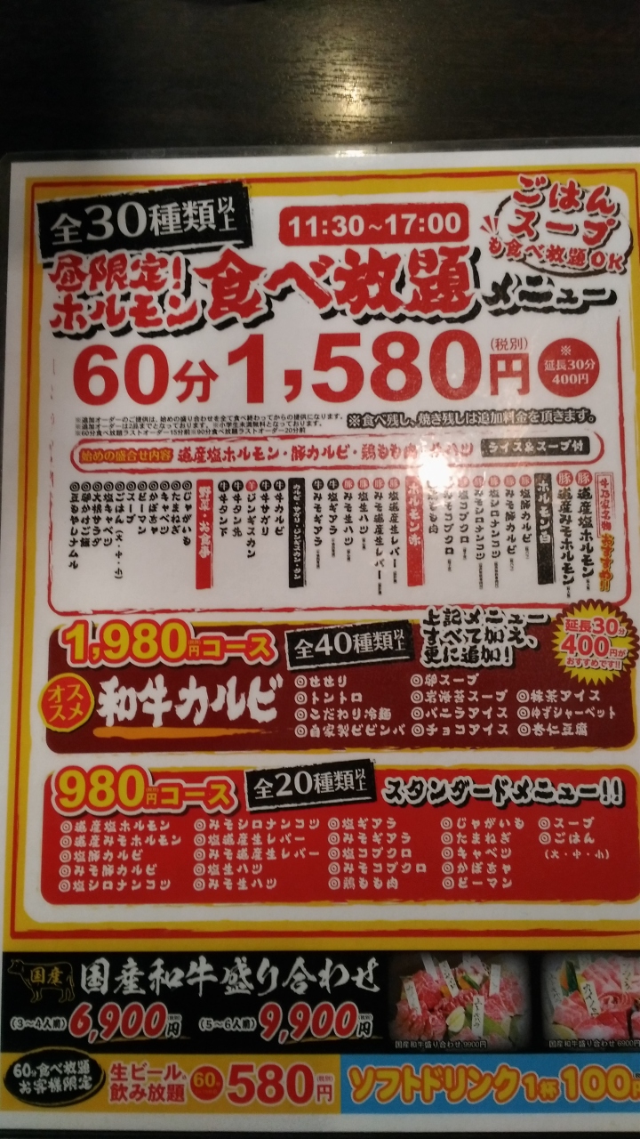 ホルモンの食べ放題などのお得なランチがあるのでお昼時には行列ができていることが多いんですが、天気が悪かったこともありこの日はスムーズに案内されました。