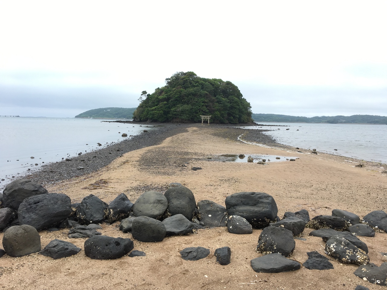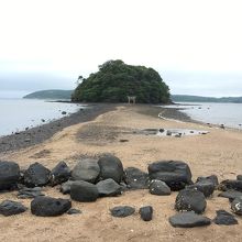 干潮時には海が割れて参道が現れる、パワースポットです。満潮時には、島に戻ります。参道に渡る手前の方には、海藻が流れ着いて固まっていて、滑りそうになるので、要注意です。岸には数台分の駐車場もありました。