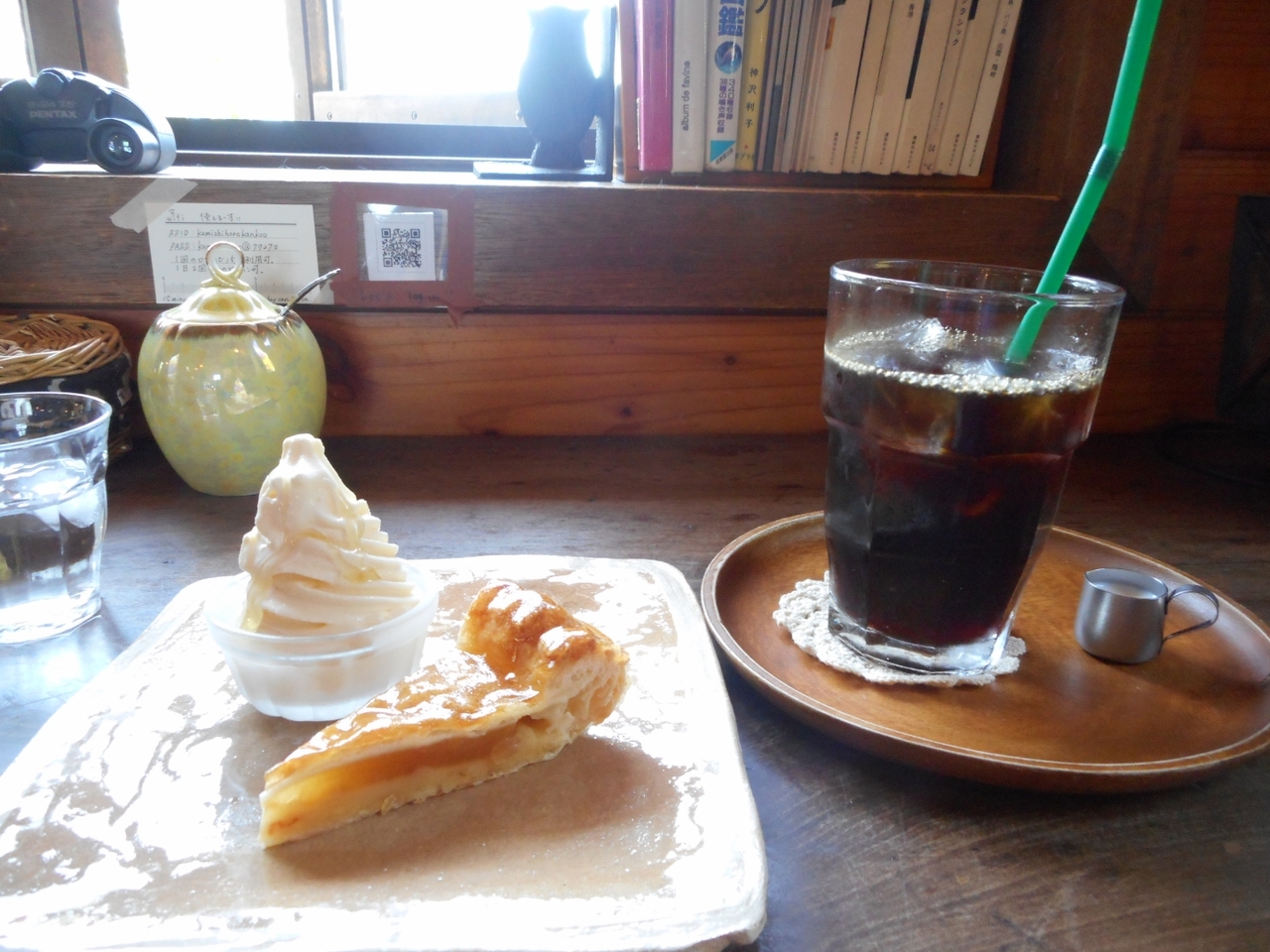 注文したのは深煎りのアイスコーヒー「樹海」とアップルパイ。ハンドドリップで入れたコーヒーは香り高く、運転で疲れた体に染み渡ります。アップルパイは普通でしたが、添えられていたアイスは、ミルクの味が濃厚で美味しかったです。
