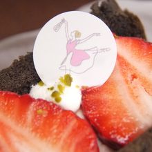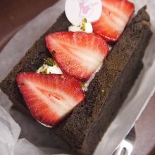厚くスライスしたココア風味のシフォンケーキに切れ込みを入れ、間に生クリームとイチゴを詰め、半分にカットしたイチゴを断面を上にしてトッピング。