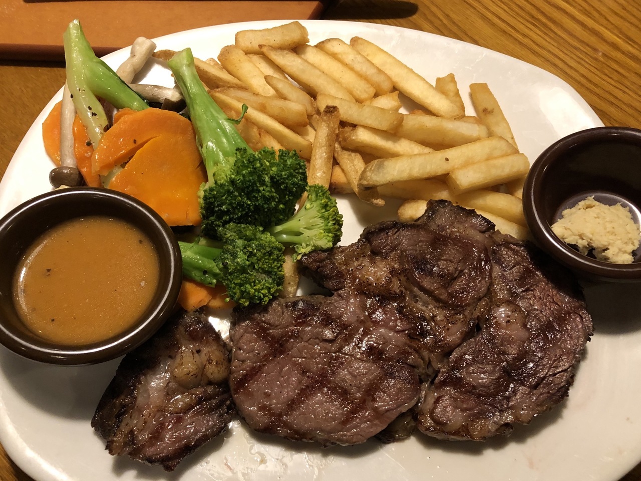 お肉にはサイドアイテムが、コールスロー、バターライス、温野菜、フライドポテト、マッシュポテト、ベイクドポテトから2つ選べます。また、カップスープ、ハウスサラダ、シーザーサラダから1つ選べます。