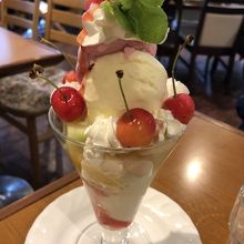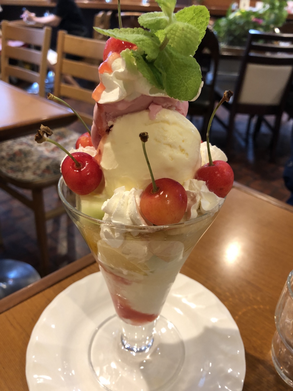 季節のパフェを頼むと、さくらんぼか、メロンか、柑橘のどれかということで、サクランボにしました。さくらんぼは日本のさくらんぼ。アイスクリームの下も、フレークとかではなくてメロンやりんごなどのフルーツのざく切りがいっぱい入っていて大満足でした。