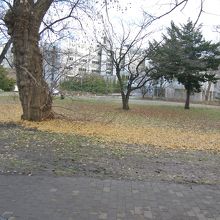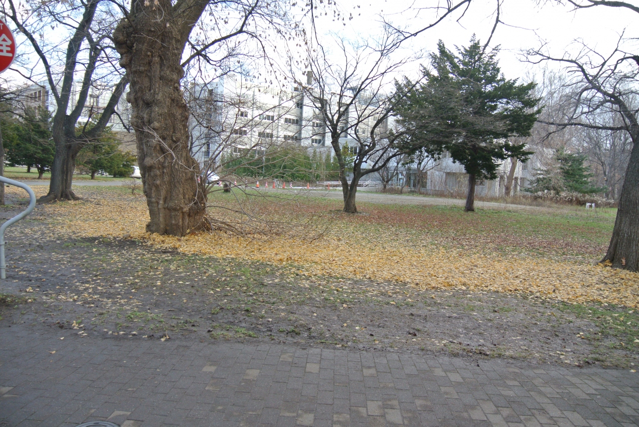 医学部歯学部の南側にあります。北大といえばポプラ並木の印象が強いですが、銀杏並木もあるんですね。ただ、訪問時は葉がすっかり枝から落ちて、黄色い葉っぱが地面に散り敷いているだけで、ちょっと残念でした。訪問時期がもう少し早ければよかったのかもしれません。