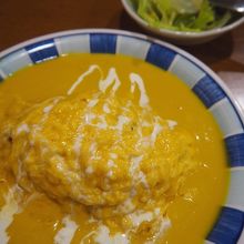 パンプキンソースは、その名の通りカボチャベースの、明るい黄色のソースで、カボチャの自然な甘味が感じられる。が、甘ったるくはなく、料理のソースとしてしっかりと成立している。あまりにもたっぷり掛けてあるので、オムライスがプールの中に浮かんでいるかの様。