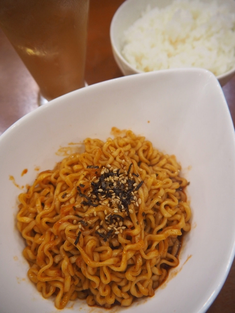 ラーメンの麺を、ブルダック[ブル(불。火、激辛)ダック(닭。鳥肉)]という真っ赤なソースで絡めてある。