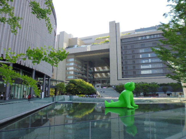 大阪駅の北口はまだまだ開発中ですが、いまある北口のところが広場になっています。大きなグリーンのクマが水に座っていて、なかなかの風景です。